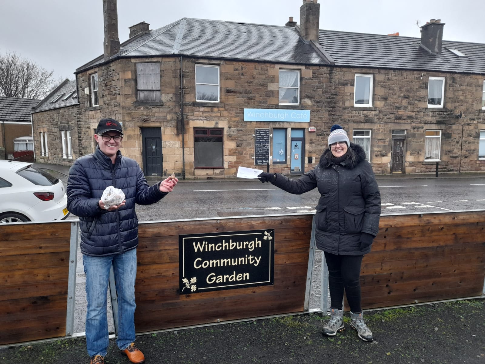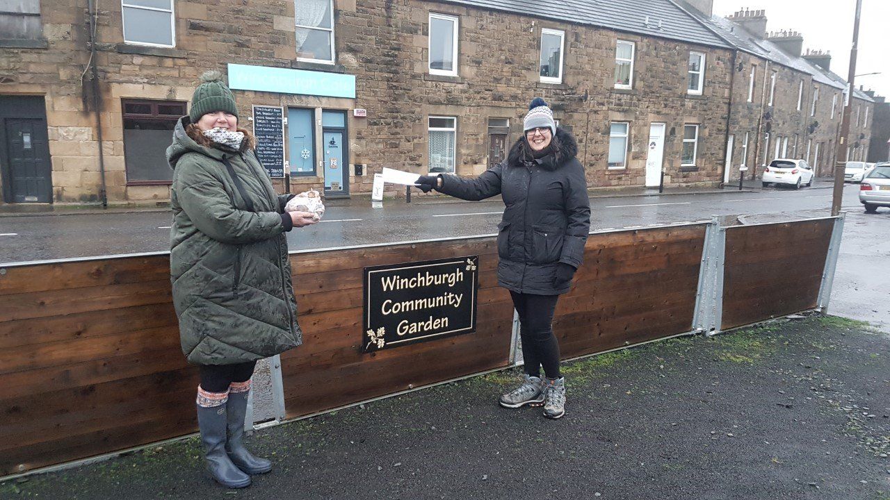 Kirsty from Scotmid presented a cheque for £250.00 at the community garden which paid for all of the bulbs planted!